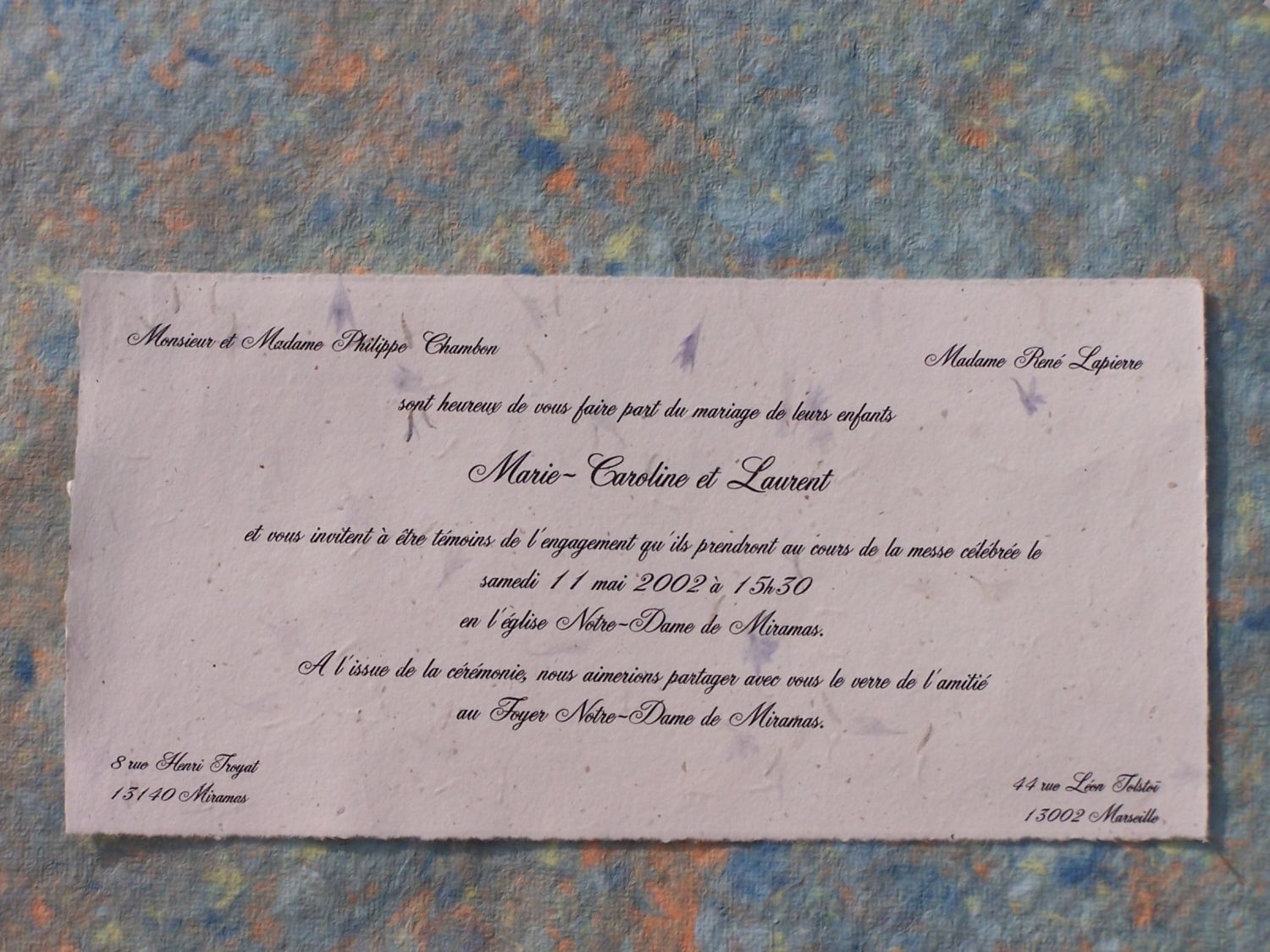 | Le Faire-Part Nature Classique | pour des faire-part de mariage mais aussi des faire-part de naissance, invitations pour une fête de famille, invitations à une manifestation d'entreprise ou officielle, pour des menus, des diplômes, l'impression d'un texte personnel à 1 ou plusieurs exemplaires.... Tous papiers - papiers fabriqués à la main par l'artisan Paille type "Parchemin" Fleur Bleu Bleuet Lavande Coton blanc Vert et Pailles Format 15x30 cm disponible dans toutes les qualités  Papier Fleur  Après avoir reçu vos échantillons de papiers, envoyez-moi votre texte, votre format, vos quantités, et vous recevrez un devis. Attention: si vous envoyez vos faire-part sous enveloppe, achetez les enveloppes avant de commander vos faire-part et envoyez-m'en une afin que je coupe précisément vos faire-part. Sans ces éléments, je ne peux pas vous répondre. | Traditionnellement, ce sont les mamans qui invitent au repas de noces. Ce faire-part, envoyé dans une enveloppe pourra être accompagné d'une carte d'invitation, format 10,5 x 15cm  Quelques prix (€uros) à la feuille par format et type de papier (les formats peuvent varier légérement selon les papiers faits main, coupés main) |